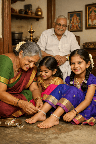 இரு ஜோடி கொலுசுகளுடன் வீடு வந்து சேர்ந்தவர் அப்போதே பெருமிதத்தோடு அவற்றைப் பேத்திகளுக்கு அணிவித்தார். அவர்களை நடக்கவும் ஓடவும் ஆடவும் சொல்லி திருஷ்டி கழித்தார். பிறகு பிசுக்குப் படிந்திருந்த தனது காலணிகளை கழுவினார்.